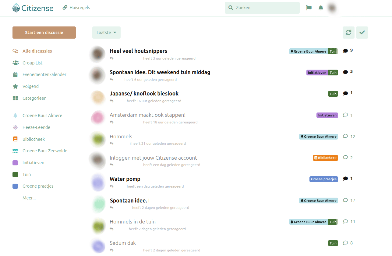Wat de community binnen Citizense onderscheidt, is de volledige integratie met de andere onderdelen van het platform. Ideën kunnen direct gedeeld worden vanuit een tuinrapport en discussies over data van sensoren of aan evenementen in de agenda. Zo ontstaat er een vloeiende verbinding tussen praten en doen — van idee tot actie, binnen één omgeving.